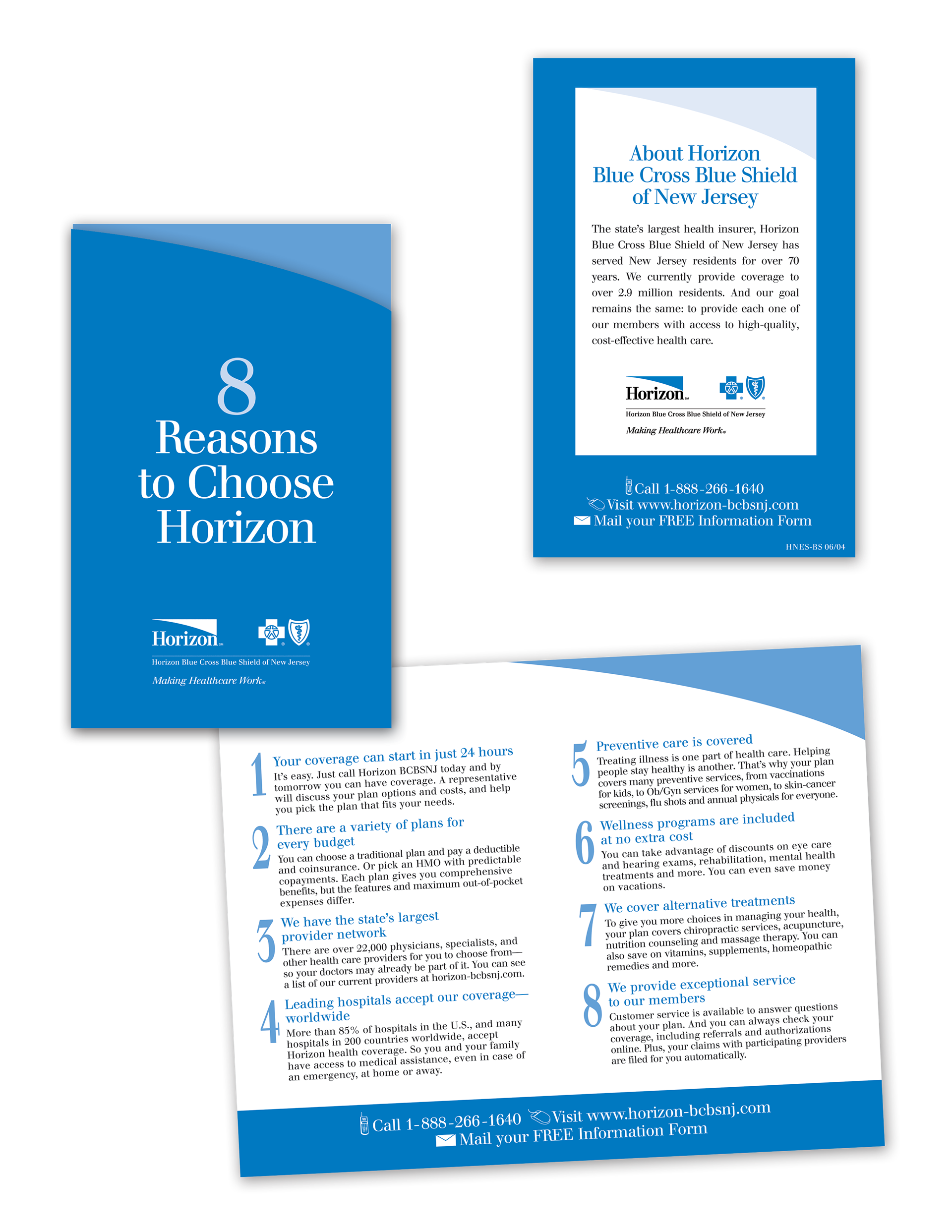 Horizon Blue Cross Blue Shield of New Jersey was looking to gain new individual policyholders from a targeted list of people (age 55 and over) who already had some insurance like Medicare. The envelope headline sets up the entire strategy of this package where we focused on how quickly and easily you can get quality health insurance for any budget. We focused on keeping the mail piece design clean but informational.